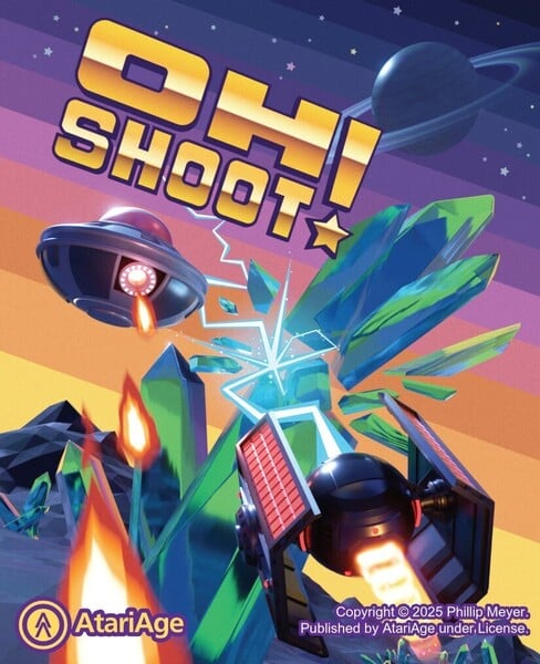 Oh Shoot! Is available in physical format from Atariage with a professionally printed box which includes the game cartridge, full color manual and a 10″ x 14″ poster. The artwork designed by William Thorup, was inspired by an early mockup by Philip Meyer.